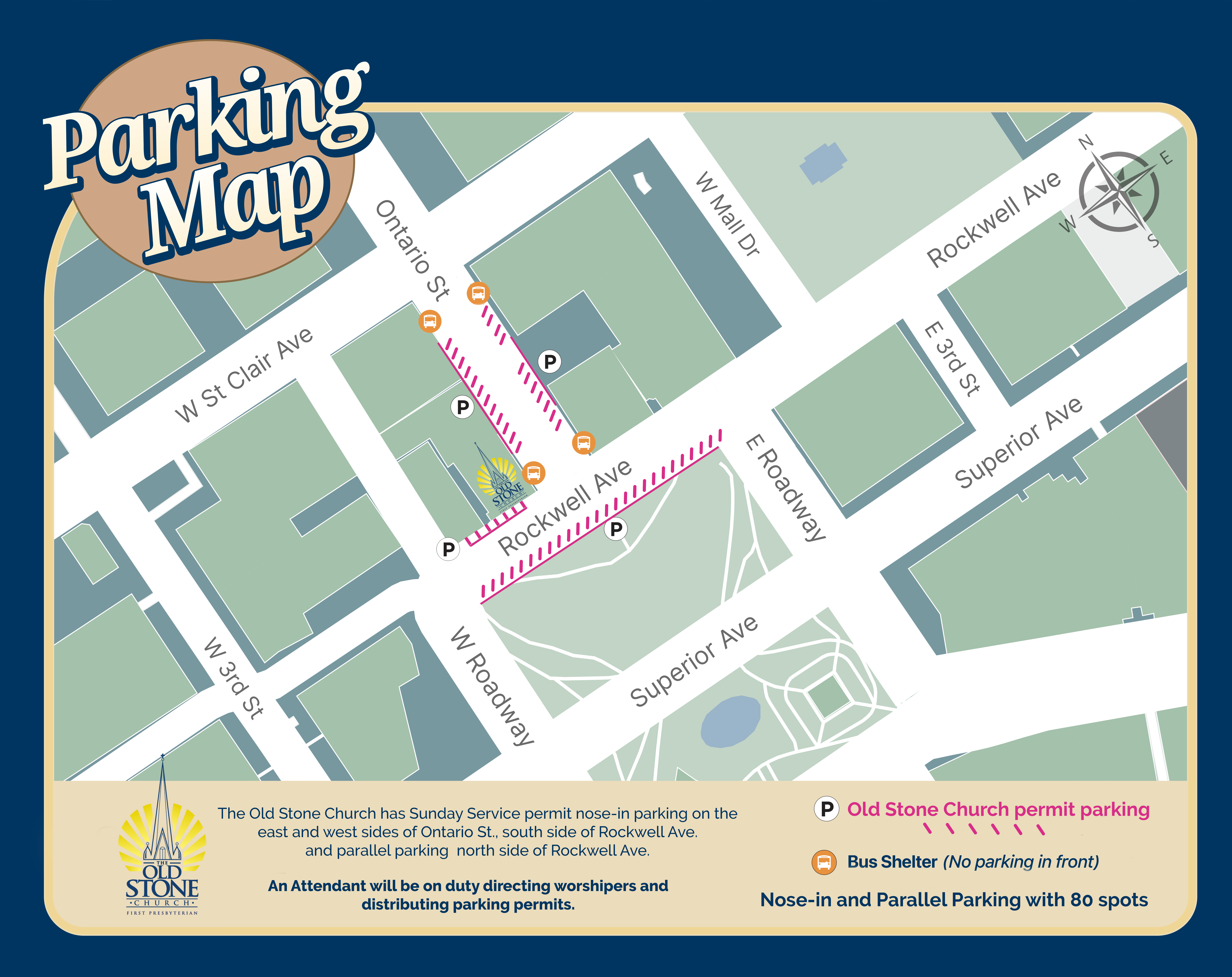 The First Presbyterian Church in Cleveland has Sunday worship service permit parking on the east and west sides of Ontario St (across from the entrance to our Parish House) and the south side of Rockwell Ave. A parking attendant (visible with a green vest) is always standing where the next car is to park.